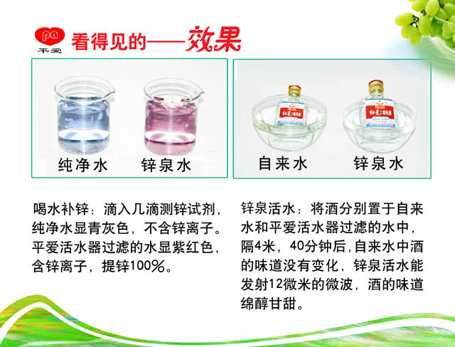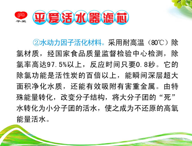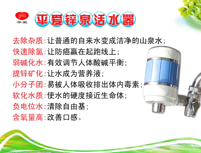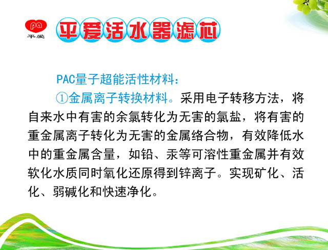 平爱锌泉活水器是源自美国先进的环保水处理技术,运用创新的PAC量子超能活性材料,采用电化学氧化还原法去除水中污染物,核心材料经NSF/ANSI美国国家卫生基金会、美国标准协会即美国食品检验局FDA检验通过。